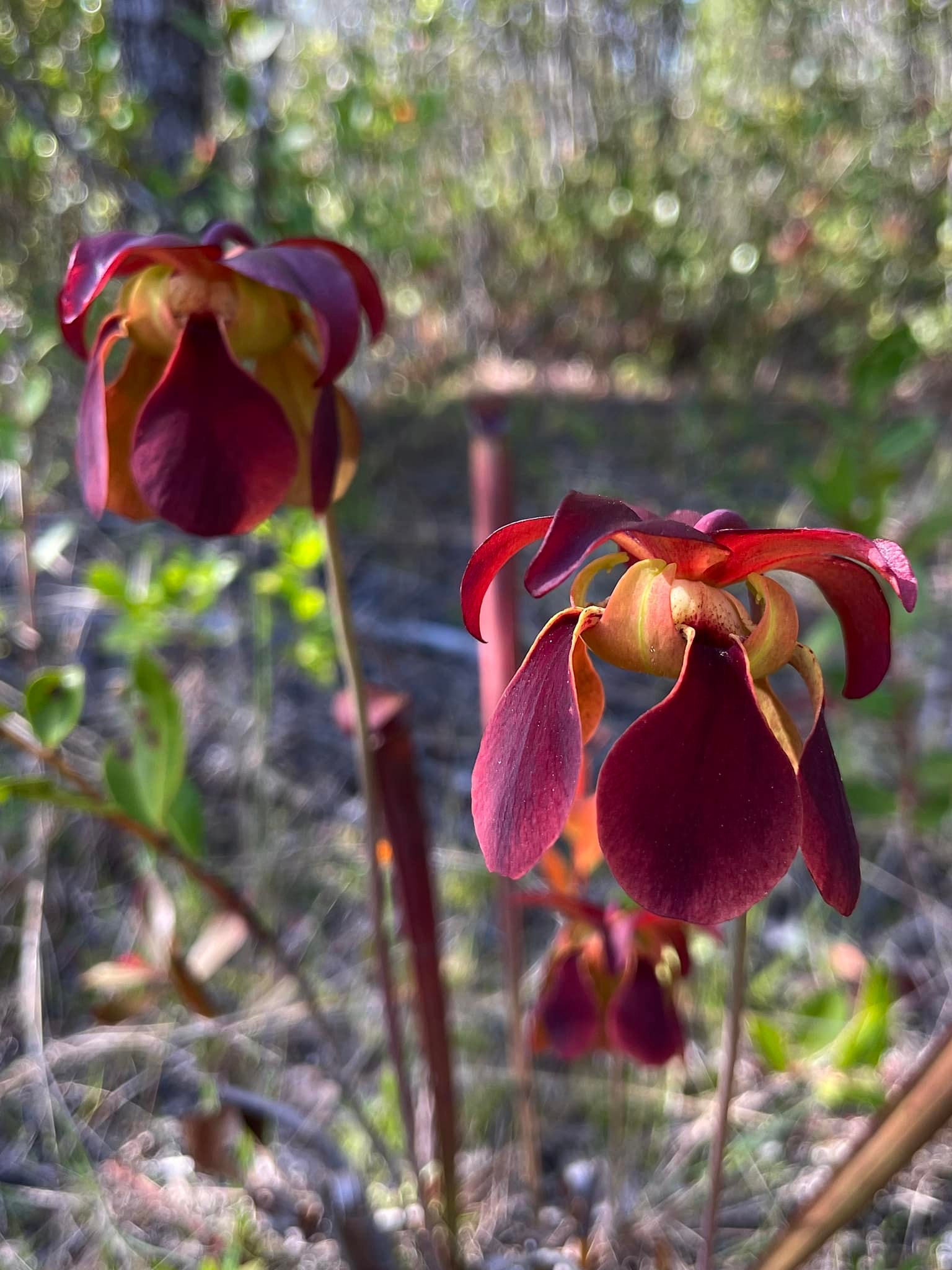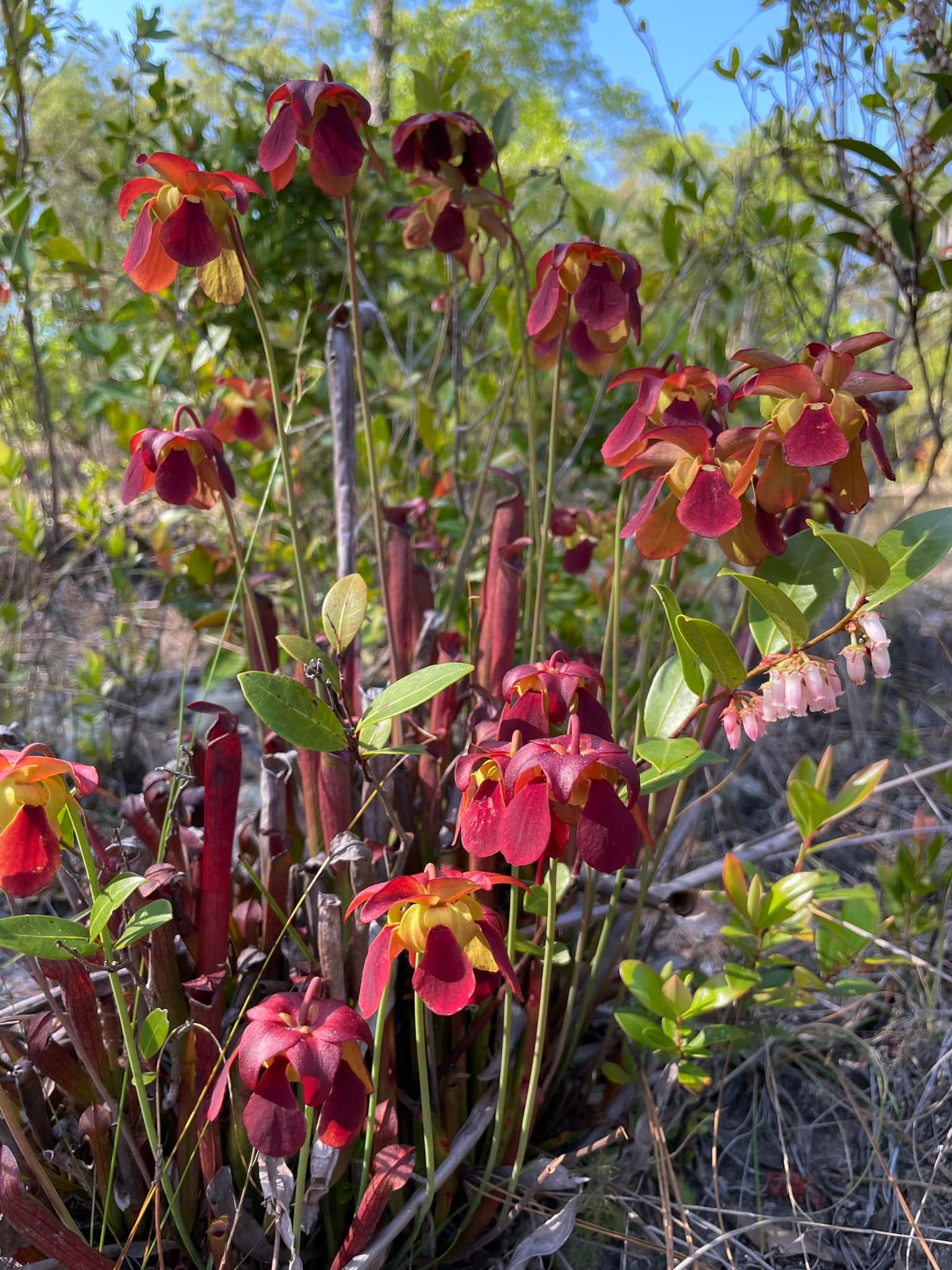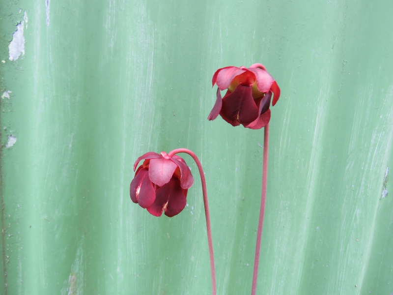 Sarracenia Rubra Gulfensis is a perennial, carnivorous plant with a horizontal, underground stem producing an aboveground rosette of leaves modified into erect, elongated, tubular pitchers. Pitchers usually less than 18 inches (45 cm) tall, slightly hairy on the outer surface, red with a network of maroon veins or green with a network of red veins; the pitcher tapers upward from base to opening, with a slight bulge in the upper part; a narrow wing runs the length of the pitcher, and a red, pointed hood is held over the pitcher opening, which is 1 – 1.4 inch (2.4 – 3.5 cm) wide. The flower stalk is 10 – 30 inches (26 – 75 cm) tall, topped with a nodding, very fragrant maroon flower. The flower is about 2 – 2.5 inches (5 – 6.3 cm) across, and consists of: 5 maroon sepals; a large, green style disk shaped like an upside-down umbrella; five dark red, fiddle-shaped petals that droop over the edges of the style disk; a warty ovary; and many stamens hidden beneath the style disk. The petals drop quickly but the sepals, style disk, and ovary (as fruit) persist for months after flowering. The fruit is a 5-segmented, warty capsule with numerous seeds.
