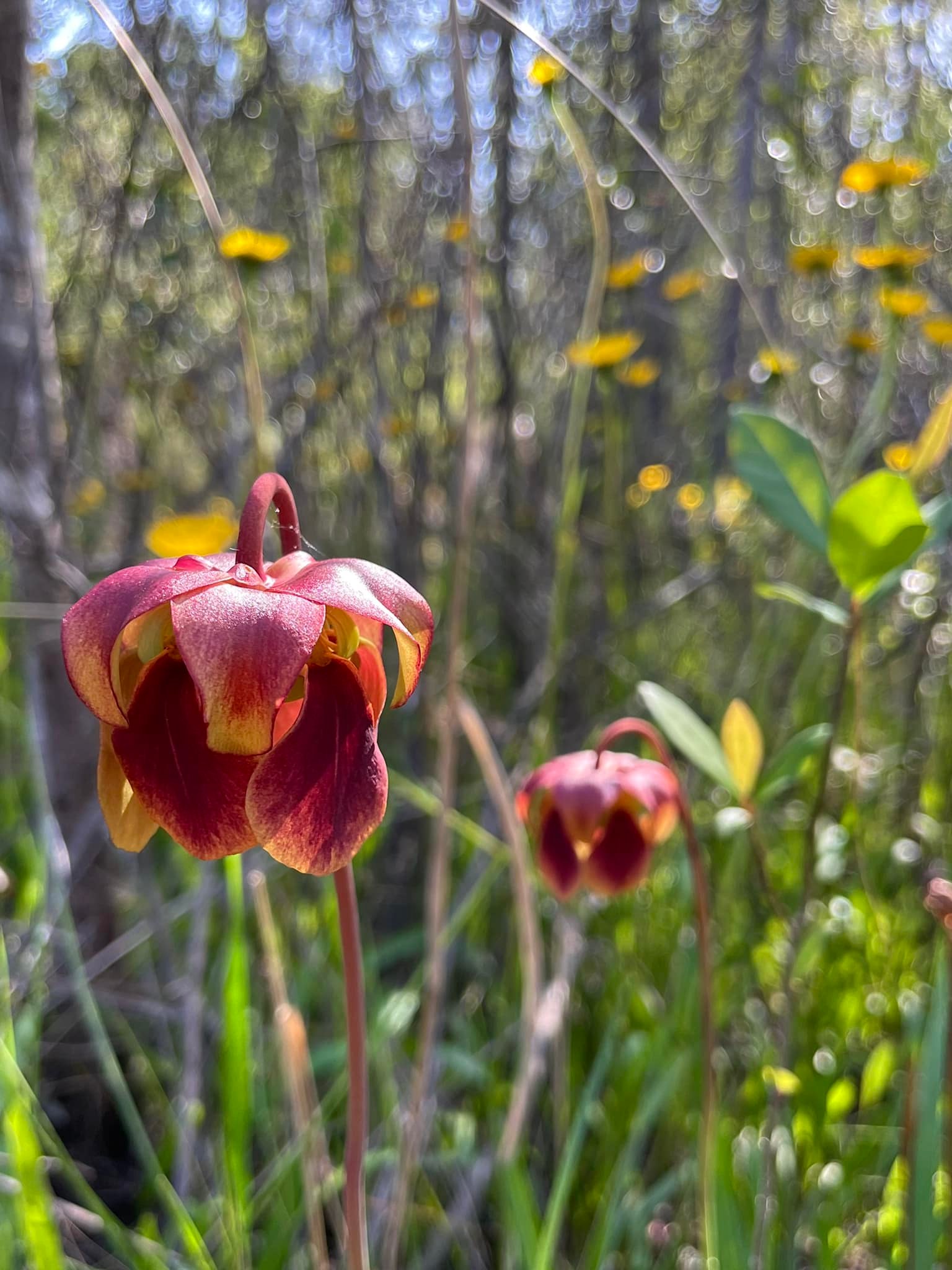 With its erect, tubular, reddish pitchers that are partially closed at the top by a hood, both subspecies of Sarracenia rubra may resemble Hooded Pitcherplant (Sarracenia minor var. minor). However, the Hooded Pitcherplant has yellow flowers and translucent or white patches near the top of its greenish-red pitcher. (For comparison with the S. rubra ssp. gulfensis plants that occur in Florida, see ‘Range’ below.)