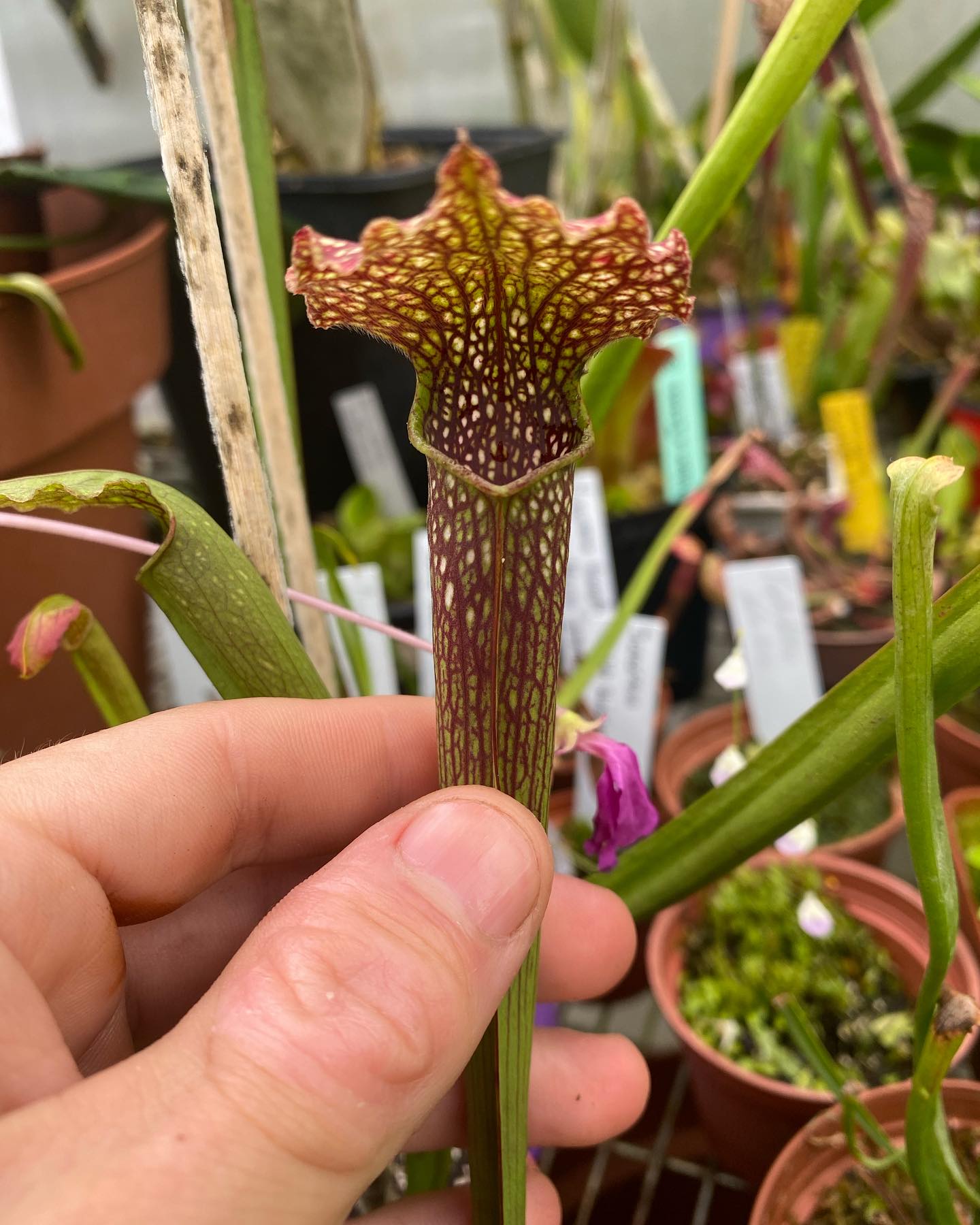 If you like giant forms of Sarracenia, this is a must have! An unusually gigantic form of rubra, which in the past has produced 2′ tall pitchers even when crammed in very overly crowded trays! In the wild, these grow on the side of streams and attain enormously gigantic traps! The best show has yet to come: all season long, these plants have been storing up nutrients and growing strong roots so that they can produce their most impressive traps in the fall. Plants offered are fully established, very healthy divisions, last picture shows what you can expect.